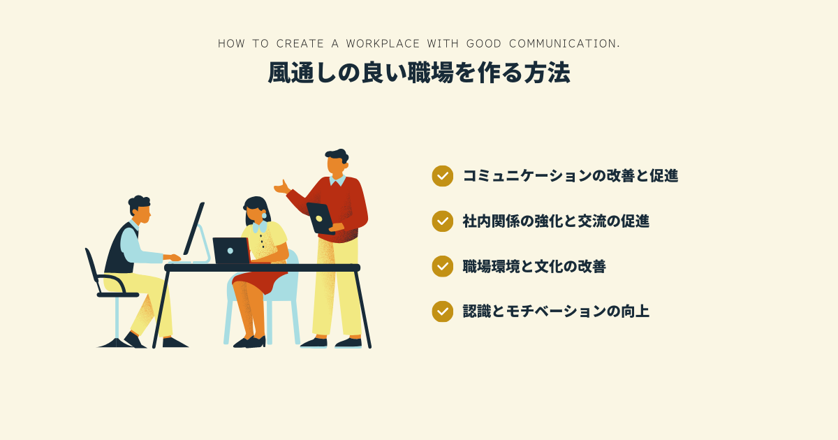 風通しの良い職場を作るための施策には、コミュニケーションの改善と促進、社内関係の強化と交流の促進、職場環境と文化の改善、認識とモチベーションの向上の4つの面からすすめていく事ができます。