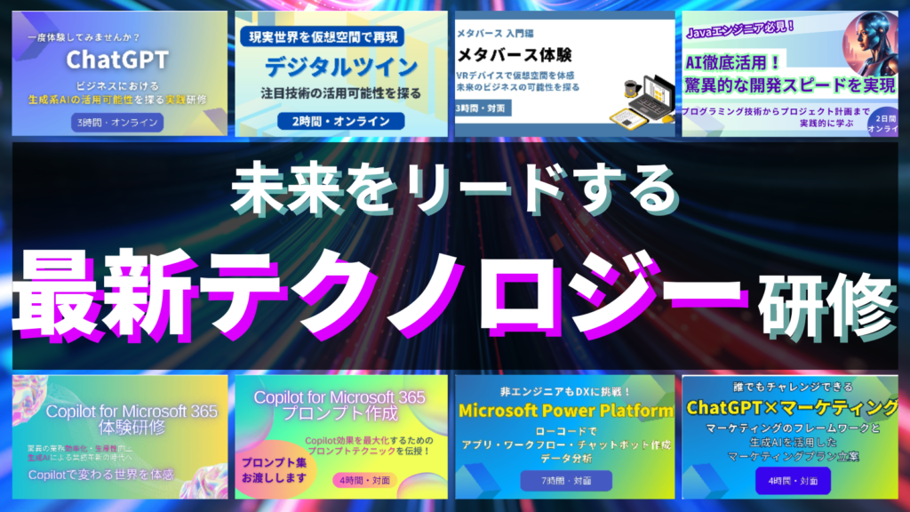 また、弊社は最新テクノロジーを学ぶための研修プログラムを迅速に開発する企画力にも定評があります。近年では、最新テクノロジーと既存のIT技術、マネジメントやセールススキルを組み合わせた研修が非常に人気です。