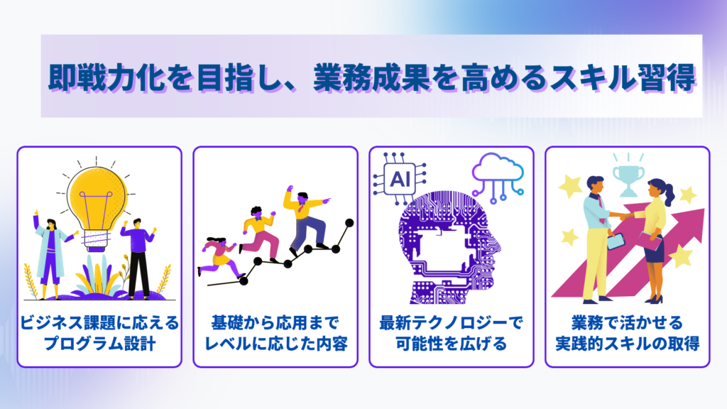 また、最新技術トレンドや実際の業務に即した事例を取り入れることで、受講後、すぐに現場で活かせるよう工夫しています。