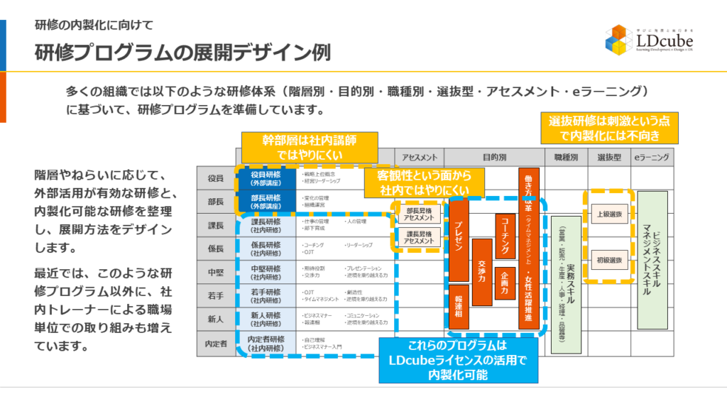自己理解、コミュニケーション、タイマネジメント、コーチング、リーダーシップ、レジリエンス、創造性開発、セルフエスティーム向上、経営意思決定力向上などです。いわゆる階層別研修で新入社員、若手社員、中堅社員、管理職層という中で扱うヒューマンスキルをベースとした研修を提供しています。