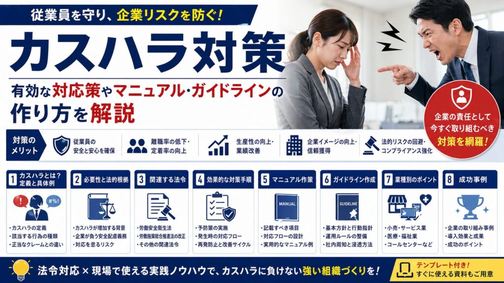 カスハラの定義と具体例/2026年10月施行の改正労働施策総合推進法における対策義務の内容/企業が講ずべき措置の3つの柱/カスハラ対応マニュアルとガイドラインの作成手順/小売・飲食・医療・コールセンターなど業種別の対策ポイント/実際の企業の成功事例。