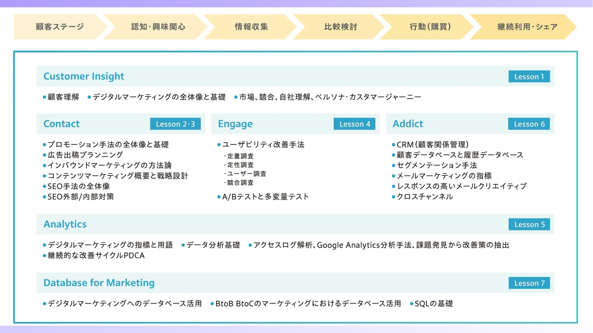 デジタルマーケティングコースでは認知・興味関心から継続利用・シェアまでの顧客ステージ全体を網羅したカリキュラムが特徴です。