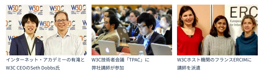 Web技術の標準化を行っている国際的な団体「W3C」には教育業界唯一のメンバーとして加盟しており、W3C本部への客員研究員の派遣、W3Cが主催する年に1度の技術者会議「TPAC」へ参加し、最新技術情報の意見交換も行っています。