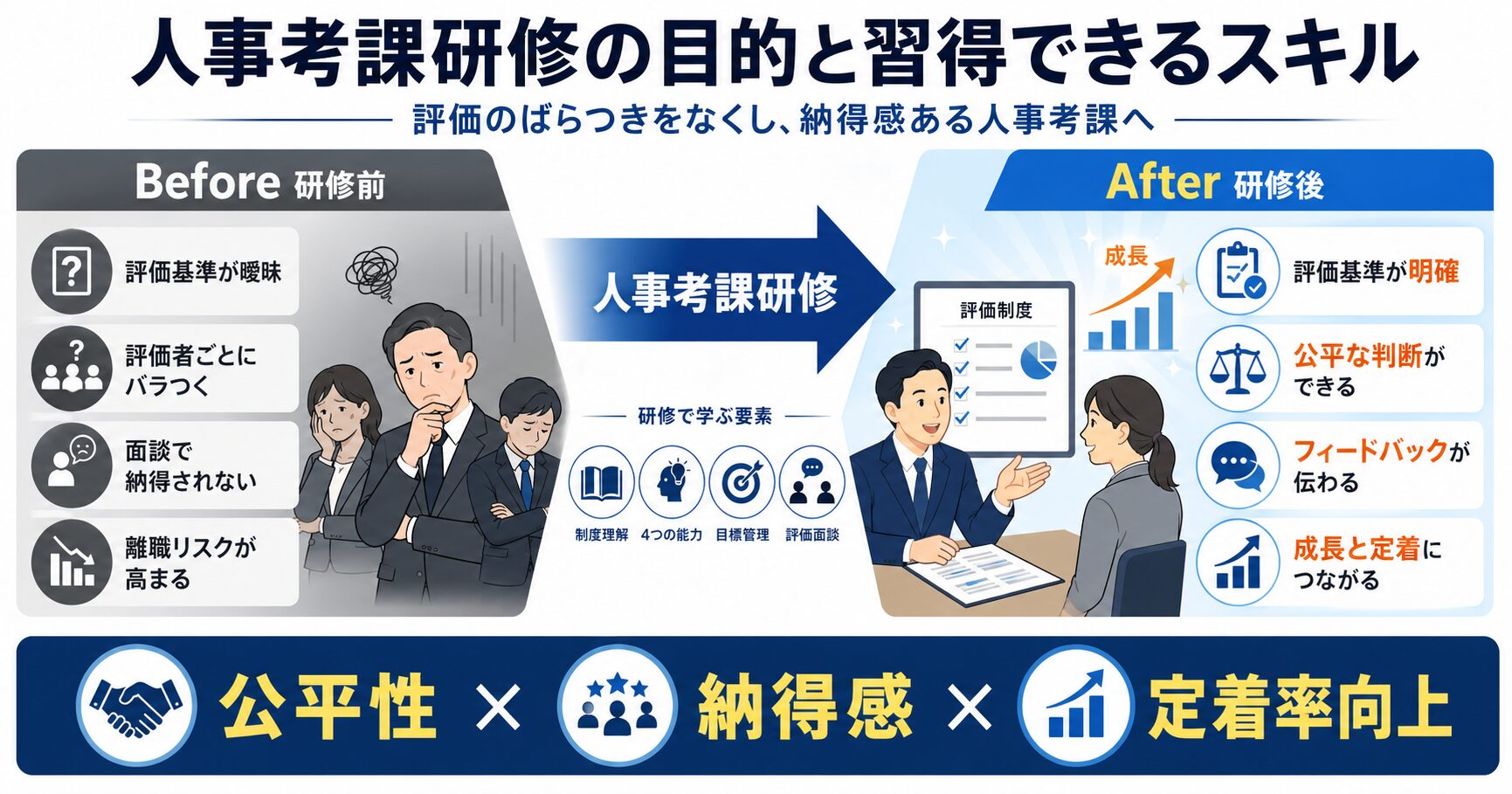 人事考課研修の最初の目的は、評価者が人事評価制度の「仕組み」と「重要性」を正しく理解することです。
