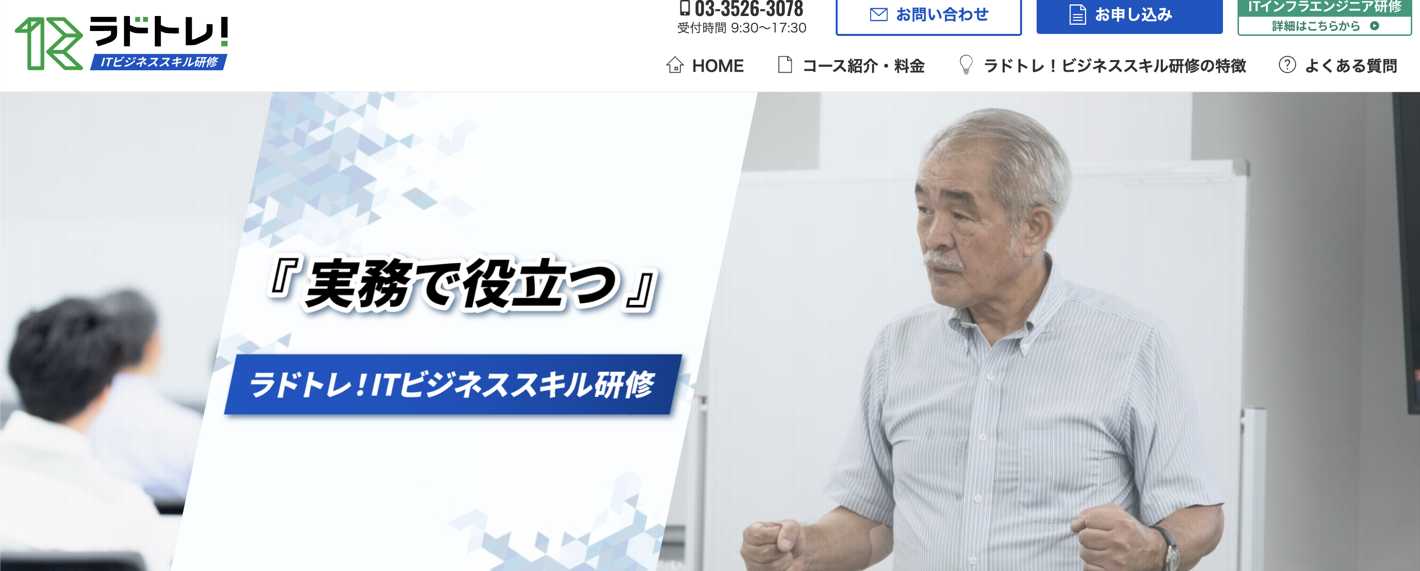 | ラドトレ(株式会社ラディアント・ソリューションズ) | ITインフラ分野で培った豊富な経験と技術力を基盤に、実務で直結する研修プログラムを提供し、多様な企業ニーズや要求スキルに柔軟に対応することで、お客様から高い評価を得ている点が強みです。 | 東京都千代田区神田司町2-8-3 第25中央ビル6階 | 詳細 |