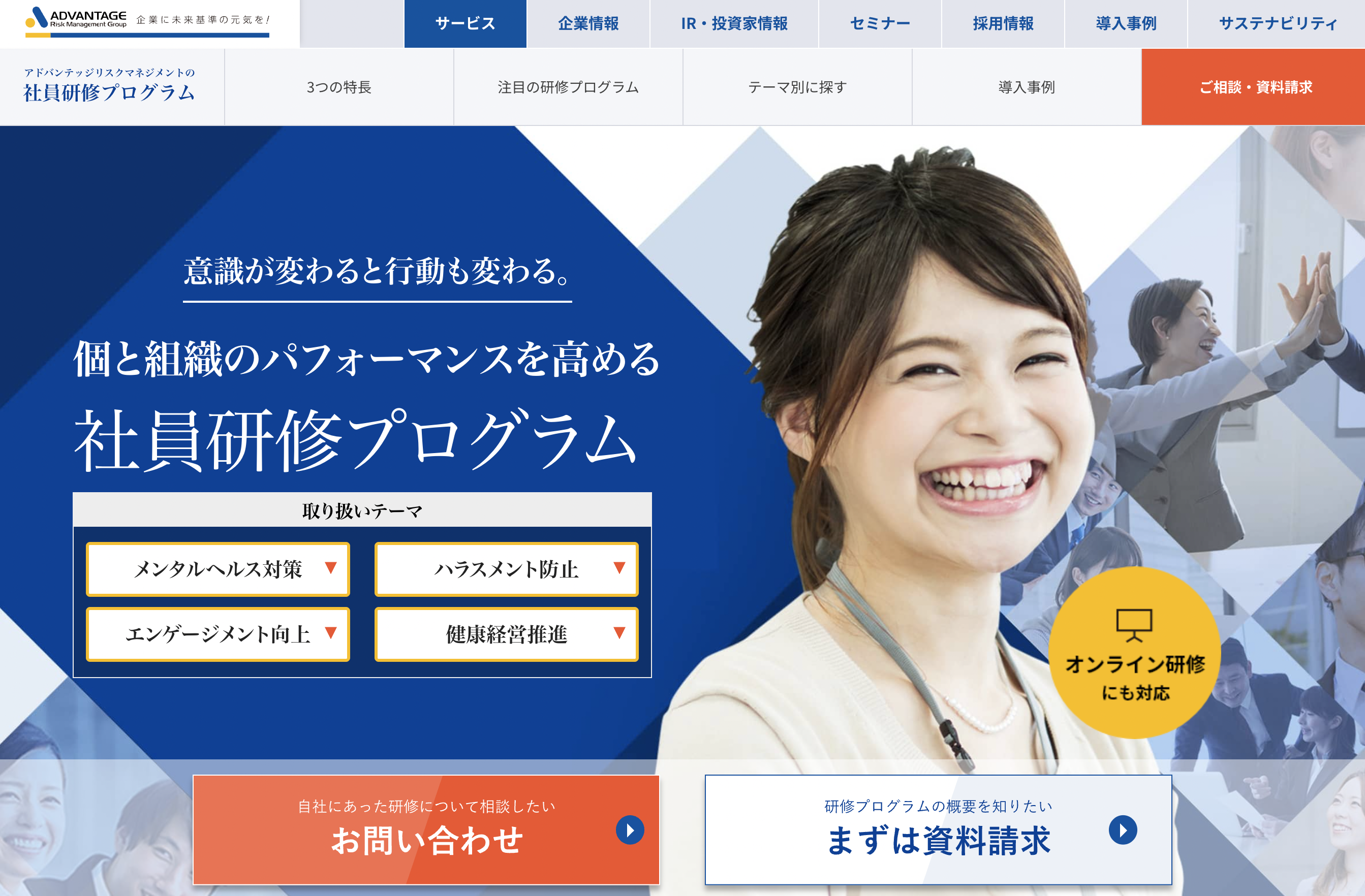 | 株式会社 アドバンテッジ リスク マネジメントの強み | 認知行動理論を活用し、顧客企業の課題に合わせた最適な研修プログラムを提供できる点が強み |