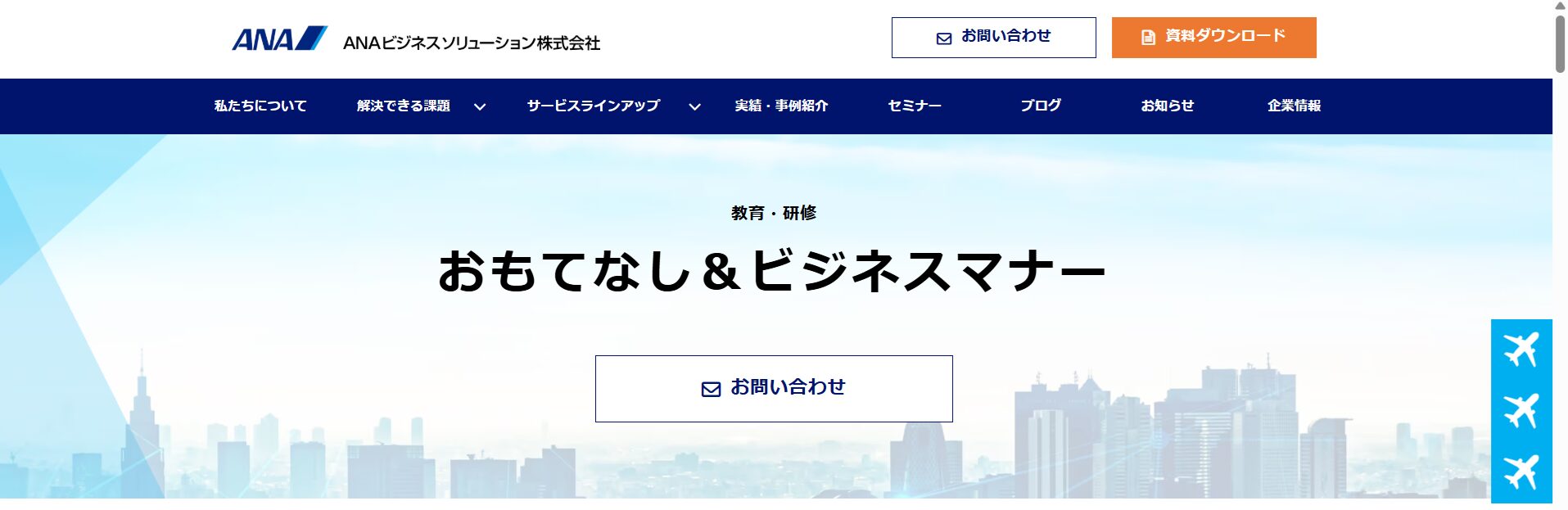 ANAビジネスソリューションは、新入社員から外国人社員向けまで幅広い研修ラインナップを提供。航空業界で培った高い対応力をベースに、信頼関係を築くためのマナーやコミュニケーションを指導します。ビジネスマナー研修のひとつ、「短時間で信頼関係を築く ANA流 ビジネスマナー研修」は、オリコン顧客満足度®調査で高い評価を獲得しています。