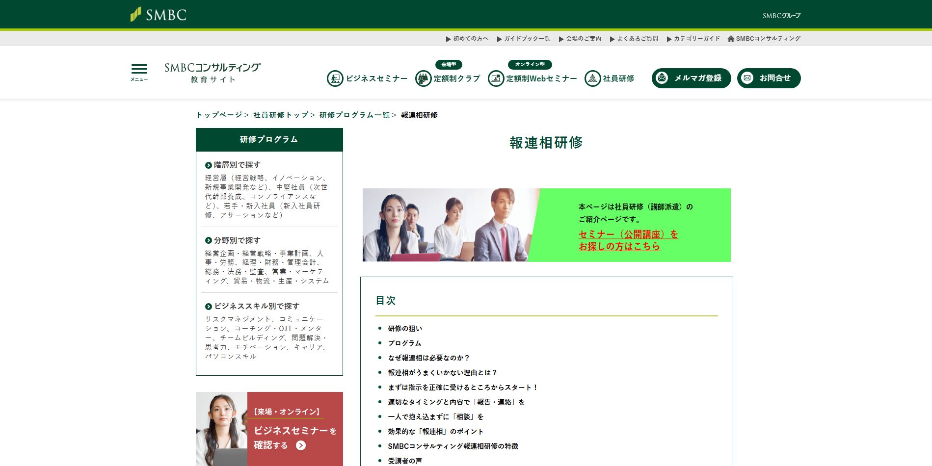 | SMBCコンサルティング株式会社 | 実践型カリキュラムと豊富な演習で、報連相スキルの定着と行動変容を促す | 東京都中央区八重洲1-3-4 三井住友銀行呉服橋ビル | 詳細 |