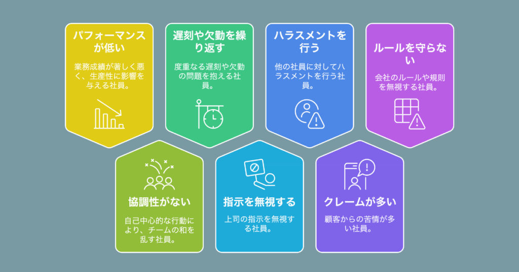 例えば、社内規則を守らない、協調性に欠けてチームワークを乱す、著しく業績が低い、ハラスメント行為を行うといったケースが含まれます。問題社員が存在すると、業務を円滑に進める妨げとなり、周囲の士気や生産性の低下を招きかねません。